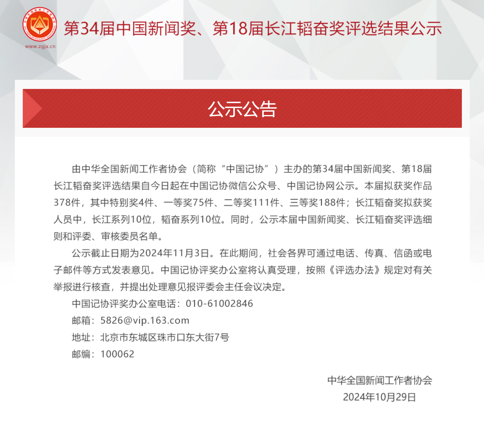 第34届中国新闻奖、第18届长江韬奋奖评选结果公示