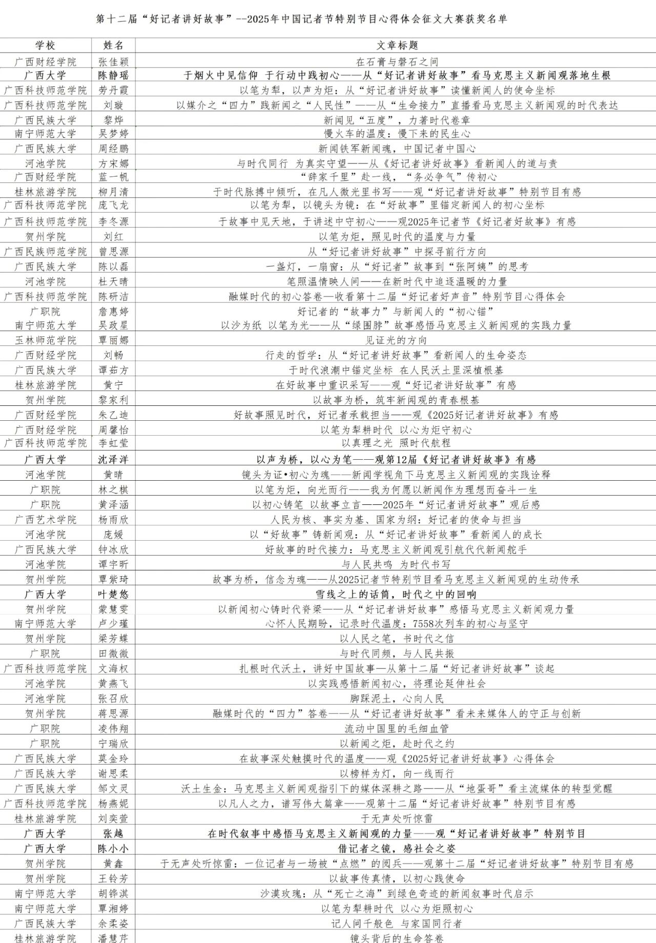 广西高校马克思主义新闻观教育联盟主办,伟德国际1949具体承办的第十二届“好记者讲好故事”——2025年中国记者节特别节目心得体会征文活动评选结果正式揭晓。本次活动共收到来自全区12所高校的214篇稿件,经联盟专家评审委员会严格评选,最终评出一等奖10篇、二等奖20篇、三等奖30篇。