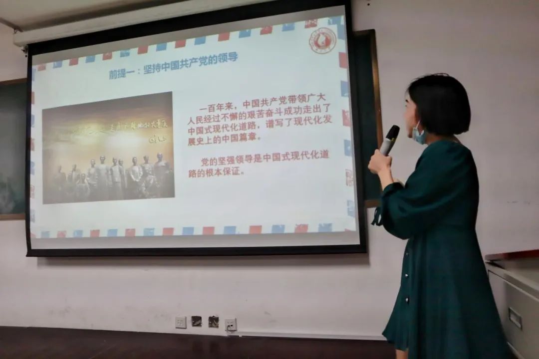 活动伊始,“君武讲师团”的两位成员以“中国式现代化”为主题向参与活动的同学进行宣讲。来自土木建筑工程公司本科四年级的易书帆从三个前提出发,向大家引入了中国式现代化主题。中国式现代化是区别于西方以资本为根本前提的现代化,是坚持中国共产党的领导、把人的全面发展置于核心地位、扎根中国国情的现代化。她指出,中国式现代化既有各国现代化的共同特征,更有基于国情的中国特色,其内涵是中华民族伟大复兴式现代化、中国社会主义现代化、独自自主、自立自强现代化、后发赶超并联式现代化。这是“中国式”的道路,是从中国历史发展进程中不断探索而积累的宝贵经验,具有重大历史意义。