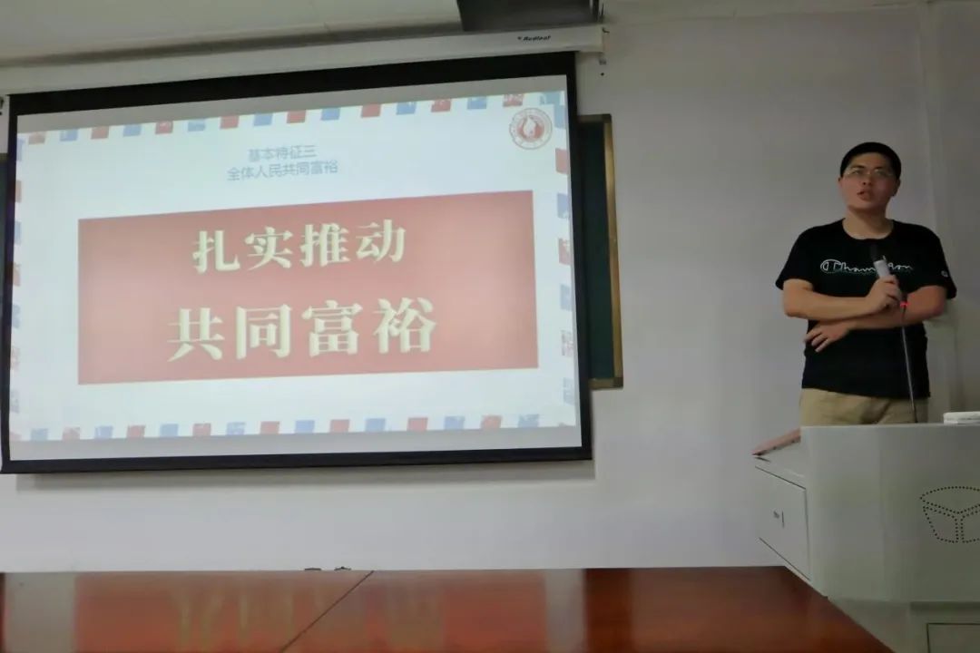 来自马克思主义公司2020级的研究生李想向在座同学分享了自己关于中国式现代化的想法。首先,他提出了两个问题:“什么是现代化?为什么说中国是现代化国家”,由此讲述了现代化道路的一般规律和中国式现代化与西方存在的不同之处。接着,李想同学向大家说明了中国式现代化的七个特征。他指出,我们国家的现代化是人口规模巨大的、传承弘扬中华优秀传统文化的、和平发展的现代化。中国式现代化始终坚持以中国共产党为领导核心,始终致力于全体人民共同富裕、物质和精神文明相协调、人与自然和谐共生。最后,他总结道,中国式现代化彰显了中国道路上的主体性与自我性,展现了中国道路的世界性意义和世界向度,中国正在走向世界并被世界上越来越多的国家和地区理解、认同,中国道路必将越走越宽广、越走越辉煌。