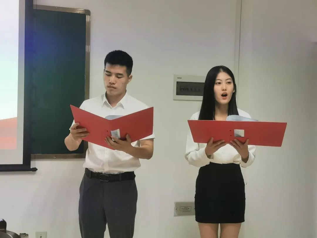 新闻二支部于晴(右一)、徐家亮(左一)进行诗朗诵