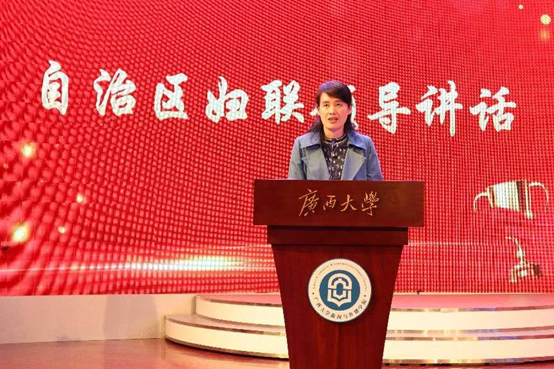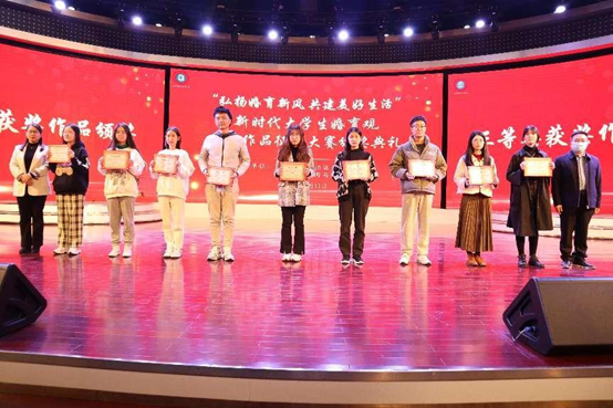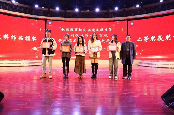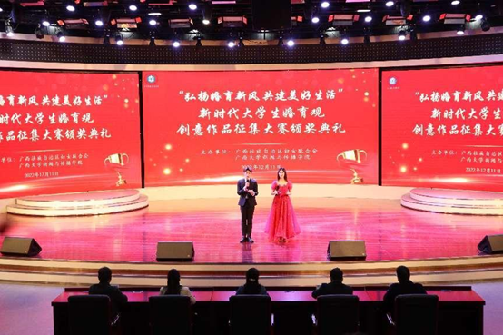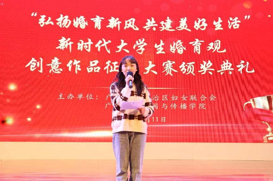 自治区妇联副主席张捷为三位一等奖获奖作品的主创人员颁奖,获奖作品包括视频《只想好好爱》、调研报告《“三孩”政策下广西老员工生育价值观调研报告》、视频《近六成老员工希望在26-30岁结婚,80%偏好两个子女》。三个作品传达了同学们对新时代婚育观、新兴婚姻伦理的深刻思考、感悟以及对美好生活的向往,弘扬了青春主旋律。