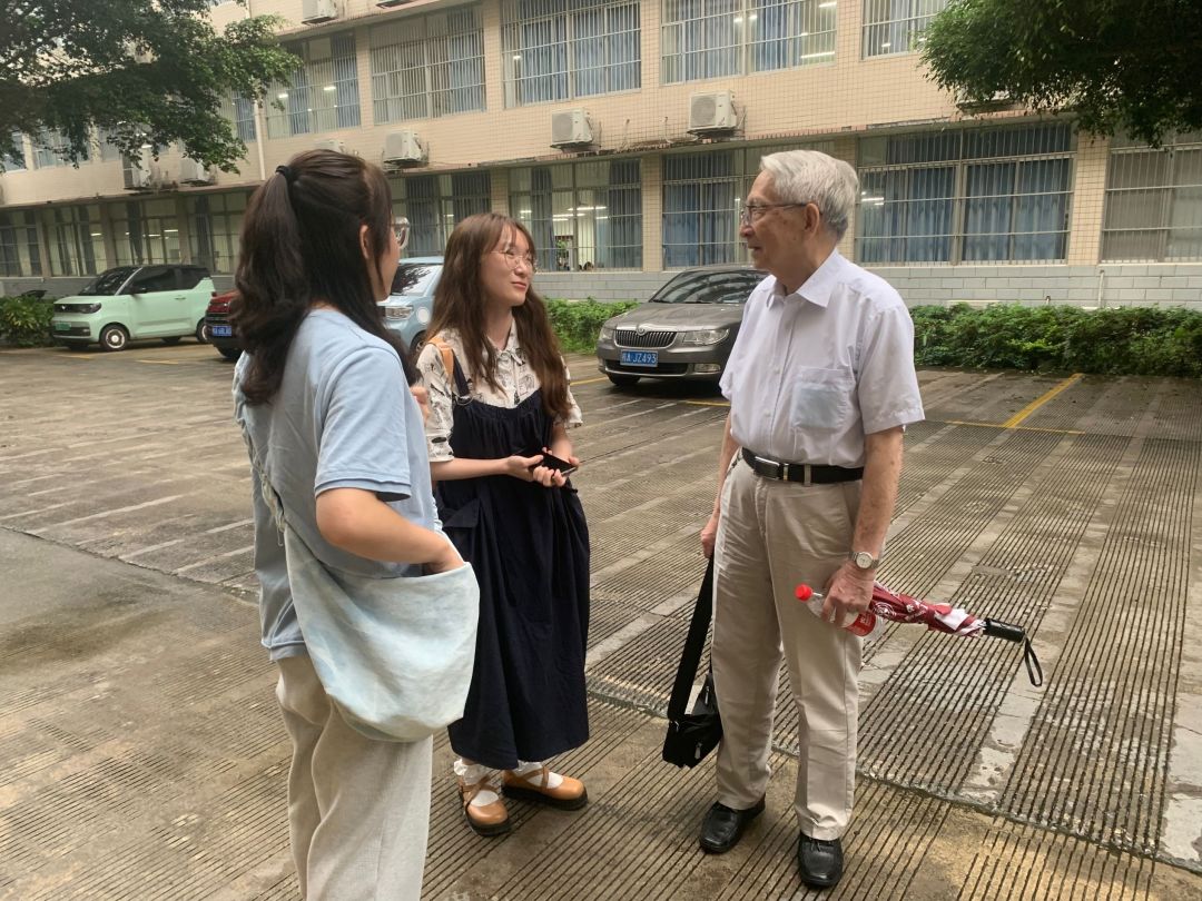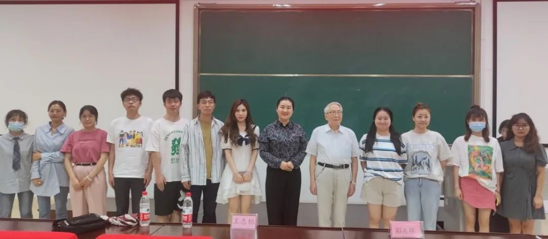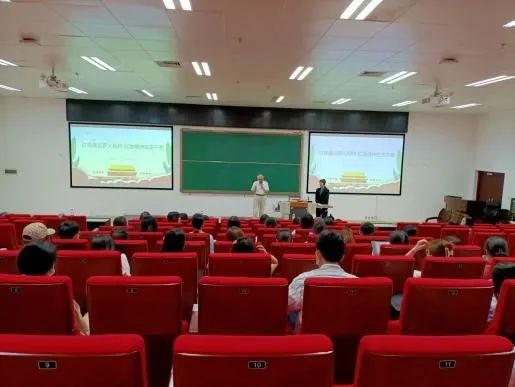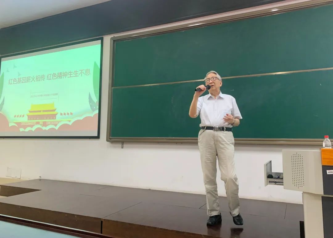 随后,物理公司退休老共产党员阳兆祥教授与同学们分享了他和共和国一起成长的人生经历,使在座的同学深受鼓舞和启发。他首先借用了毛泽东访问苏联时在莫斯科大学接见中国职工时发表的著名演讲:“世界是你们的,也是我们的,但是归根结底是你们的。你们青年人朝气蓬勃,好像早晨八九点钟的太阳。希望寄托在你们身上。”以此表达对年轻一代的期望。