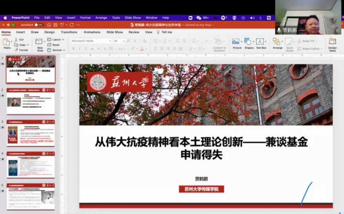 1月22日晚,公司邀请苏州大学传媒公司贾鹤鹏教授作题为《从伟大抗疫精神看本土理论创新——兼谈基金申请得失谈》的讲座。本次讲座在腾讯会议线上举行,由公司气候与健康传播研究中心主任吴海荣教授主持,副经理王辉以及100多位师生在线聆听。