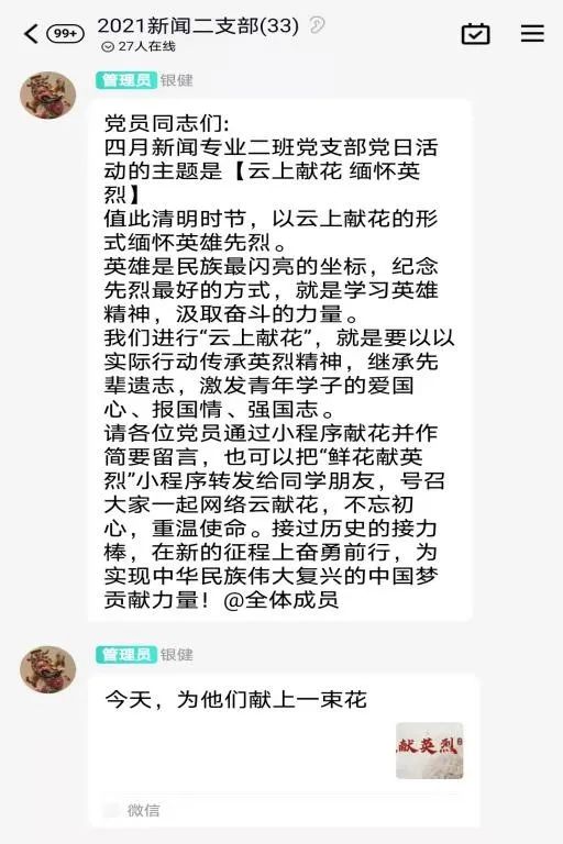 值此清明时节,新闻二支部以人民日报制作的小程序为载体,号召支部同学用“云上献花”的形式来缅怀革命先烈,留下哀思并将其积极转发给身边的亲友,带动更多的人参与进来。在疫情特殊时期,用新传人的方式,寄出哀思,不忘初心,重温使命。