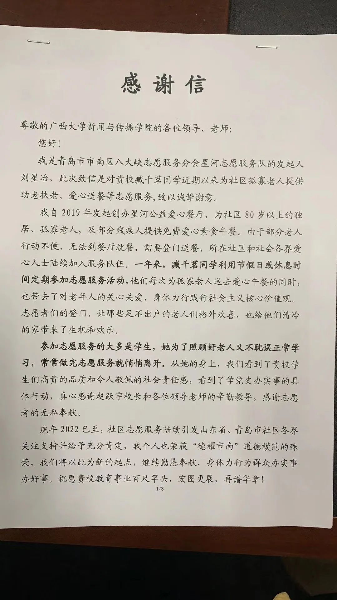 伟德国际1949新闻211班的臧千茗同学,积极响应公司的号召,在寒假期间参与志愿服务活动,勤恳奉献,得到了当地志愿服务队的认可,臧千茗同学家乡所在志愿服务队还向公司寄来一封感谢信。信中不仅夸赞了臧千茗同学的责任与担当,也表达了对公司老师辛勤教导的感谢。感谢信全文内容如下: