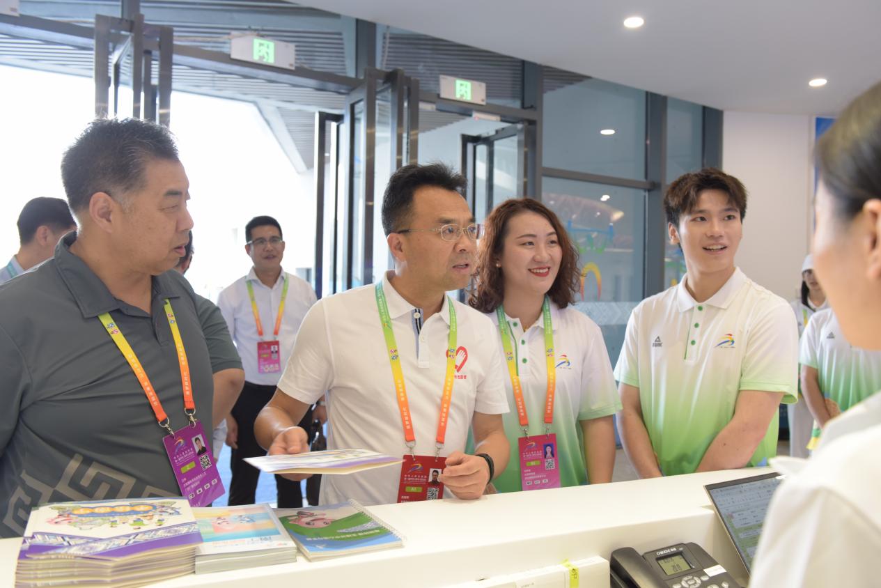 (张朝晖书记(中)考察指导学青会主媒体中心志愿者工作)
