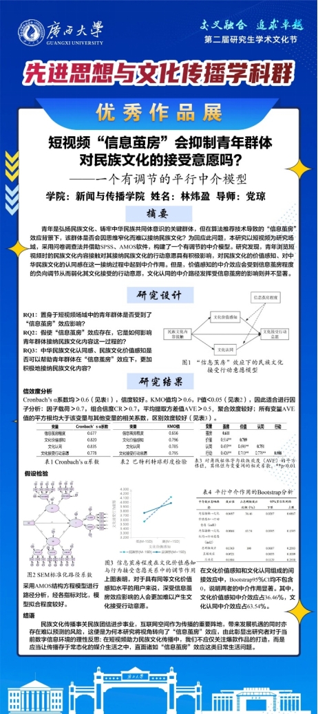 唐诗园创作的视频《邕城·老友味》、2022级专硕研究生陆雪雯的论文《文化认同视域下“那”文化铸牢中华民族共同体意识的内在联系和路径研究》、2023级学硕研究生林炜盈的论文《短视频“信息茧房”会抑制青年群体对少数民族文化的接受意愿吗?——一个有调节的平行中介模型》均荣获二等奖。