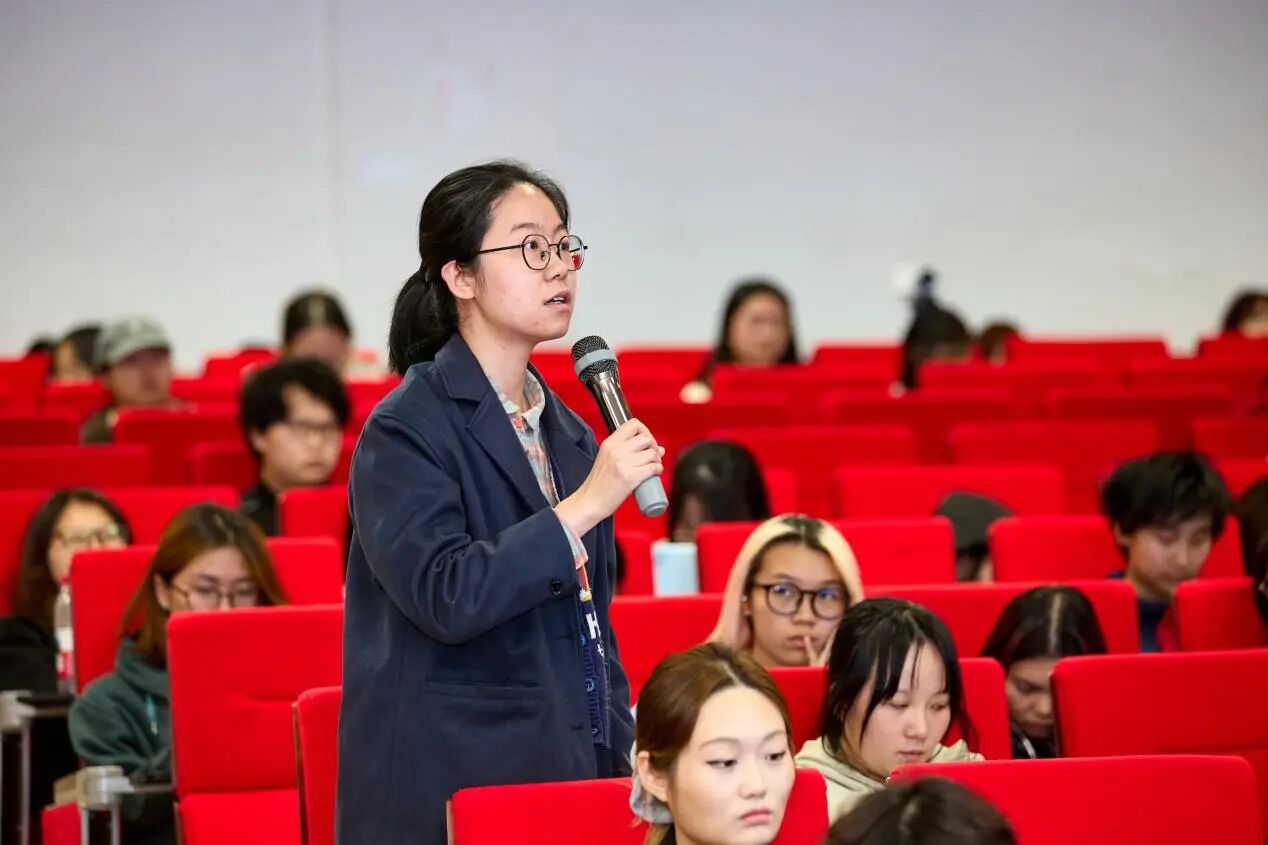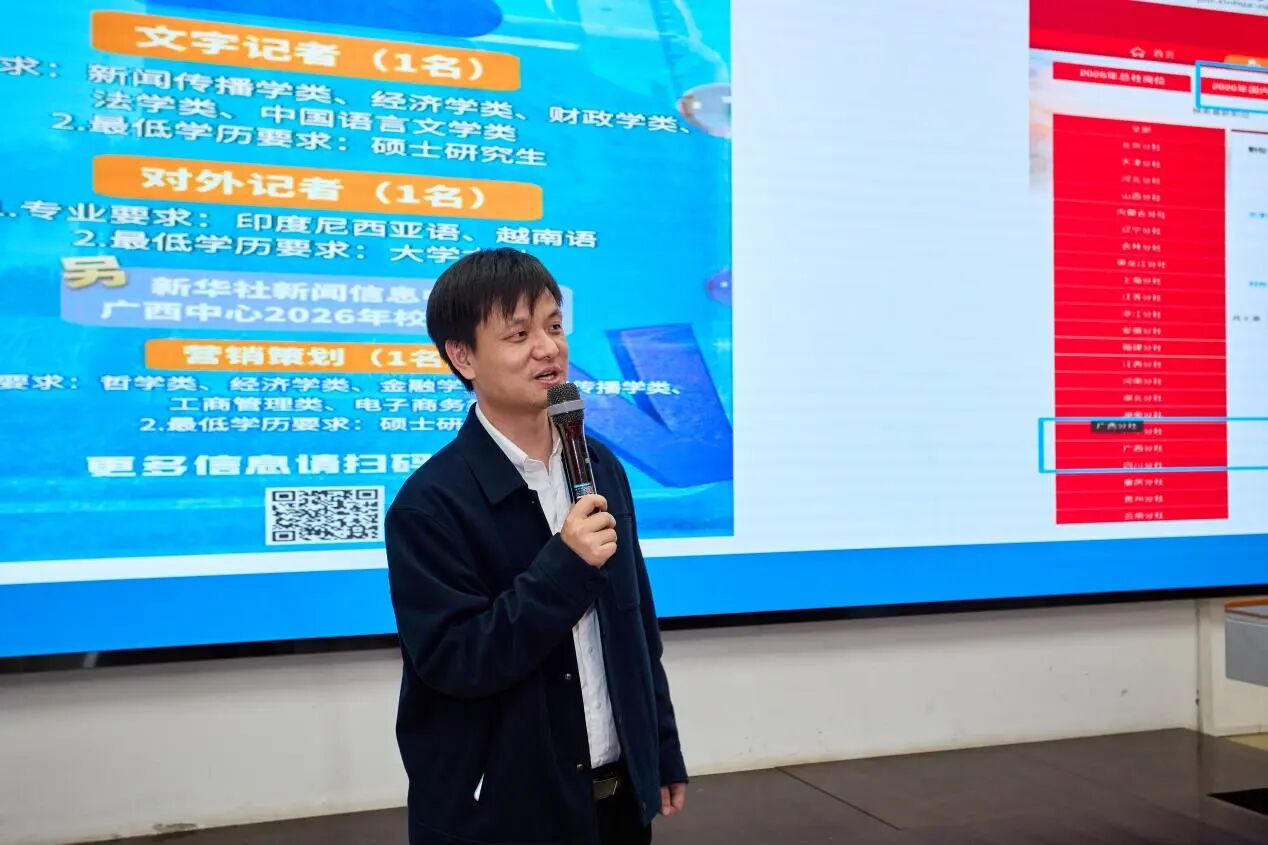 互动交流环节,新华社广西分社记者农冠斌、黄凯莹结合实战经历,生动讲述了新闻背后的故事,阐释了新华社记者坚守初心、深入现场的使命担当,分享了全媒体时代记者的职业素养与报道方法。在互动交流中,同学们围绕国际传播、媒体融合、AI技术应用等前沿议题,与记者展开热烈互动。