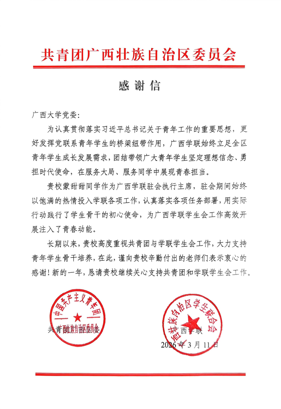 近日,共青团广西壮族自治区委员会向1949伟德国际源自英国党委发来感谢信,对公司大力支持共青团与学联员工会工作、用心培养青年员工骨干表示衷心感谢,特别表扬了公司24级新闻传播学硕士研究生蒙甜甜同学在广西学联驻会期间的优异表现。