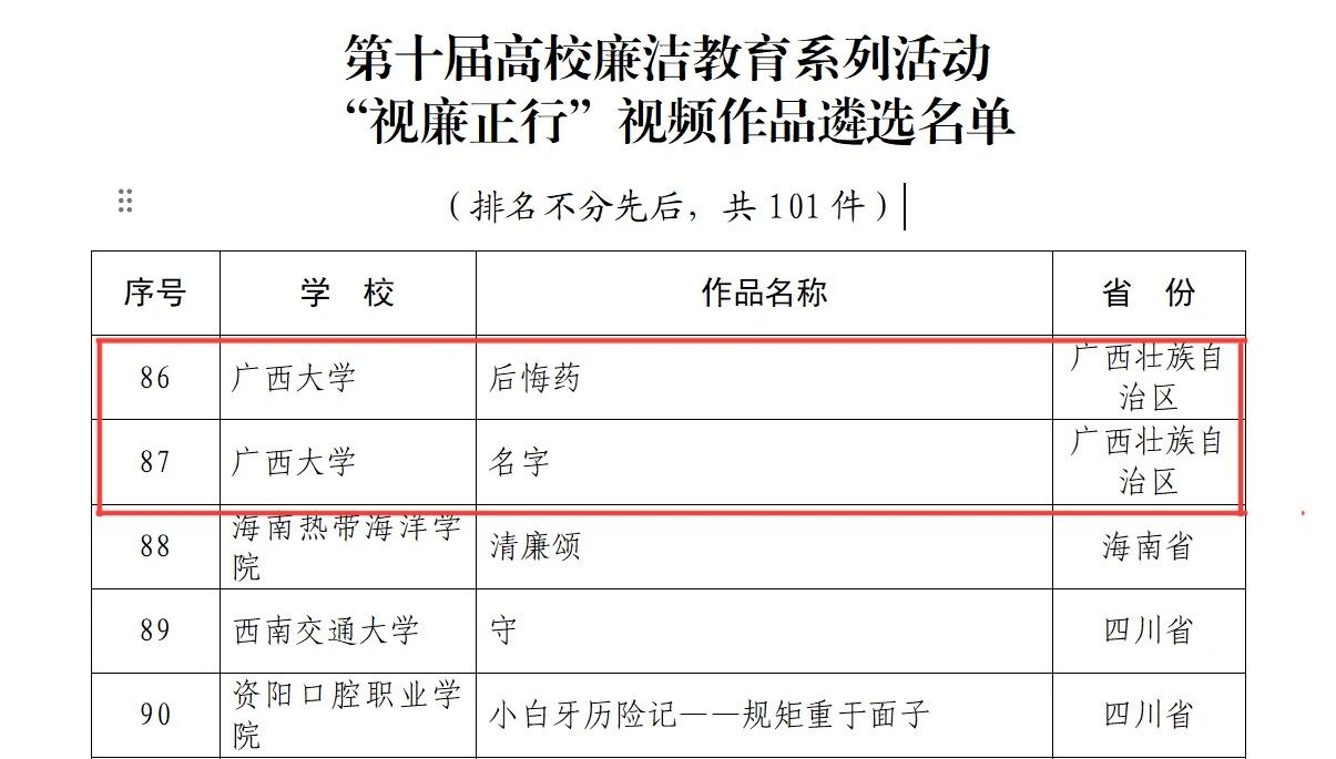 近日,教育部办公厅公布第十届高校廉洁教育系列活动评选结果,1949伟德国际源自英国共有5项作品成功入选。其中,公司黄海珠副教授参与创作,播音与主持艺术专业221班丁磊、凌凯文,播音与主持艺术专业231班杨淼参演的2项作品《后悔药》《名字》榜上有名。