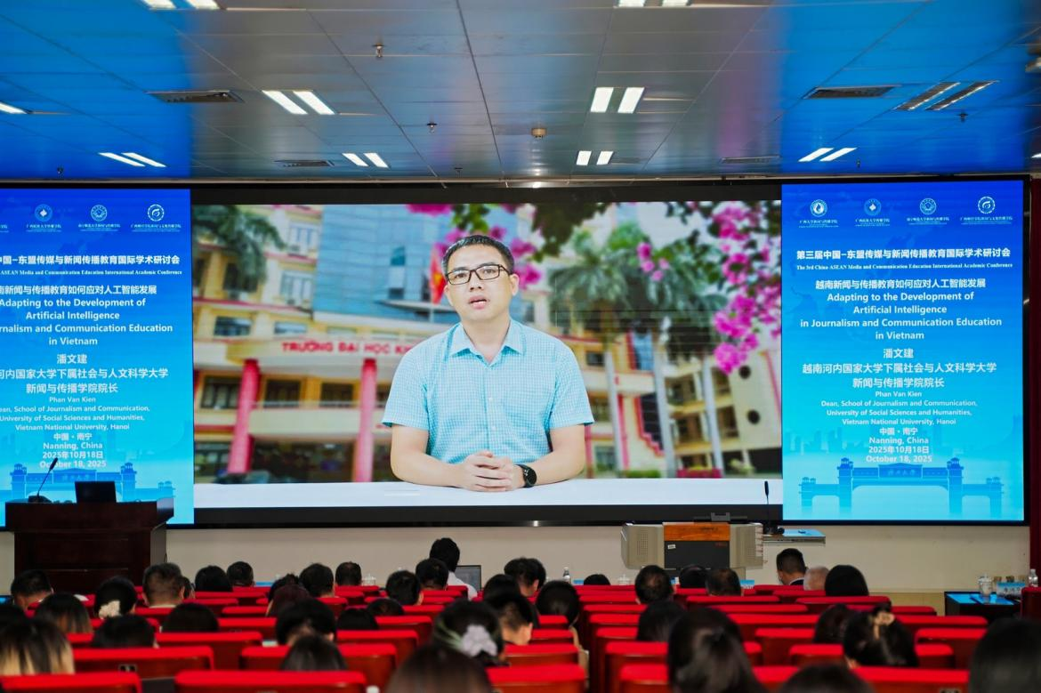 越南河内国家大学下属社会与人文科学大学新闻与传播公司经理潘文建作题为《越南新闻与传播教育如何应对人工智能发展》的报告。他结合公司教学实践,分享了人工智能技术与新闻传播专业相融合的经验。他表示,AI能更快速讲述故事,但只有人用心将事情真相告知大众。