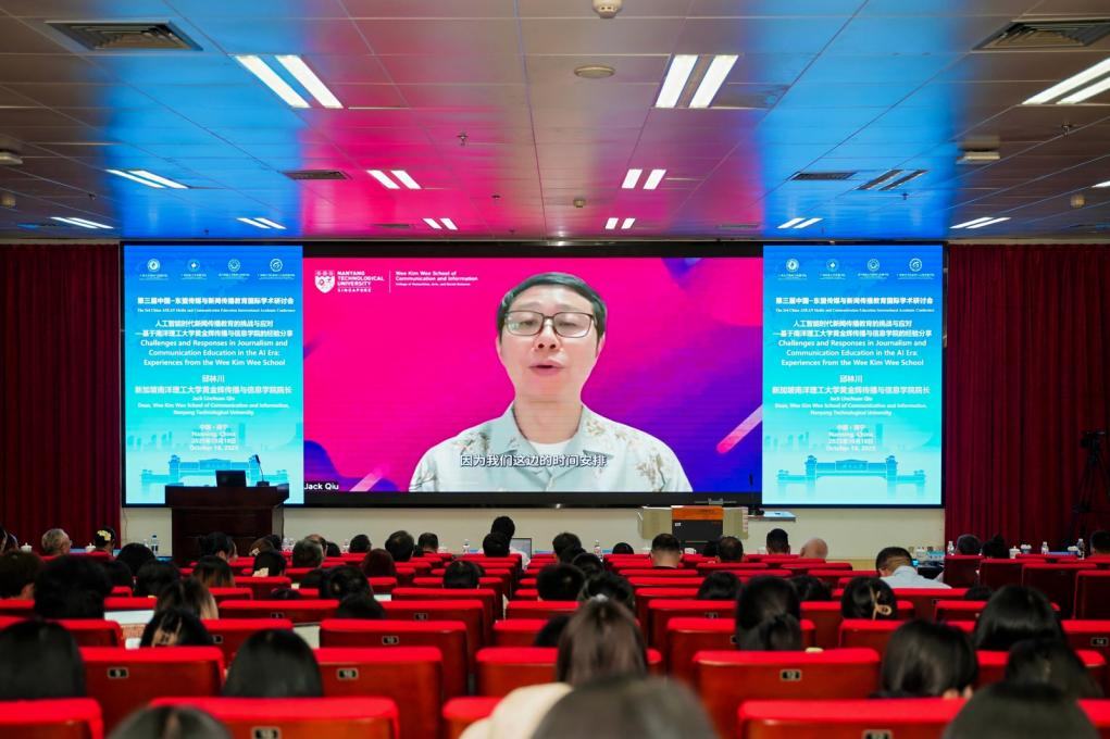 新加坡南洋理工大学黄金辉传播与信息公司经理邱林川教授作题为《人工智能时代新闻传播教育的挑战与应对》报告。他结合实践案例,探讨了人工智能时代员工的教育问题。他指出,公司最重要的宗旨是做好AI的同时,让新闻更专业、更标准,并保持自己的特色,避免成为别人的工具。他表示,在AI的时代转变教学目标,要更加强调:让新闻传播教育的员工,批判性地运用这些工具,要让员工能够找到自己的声音。