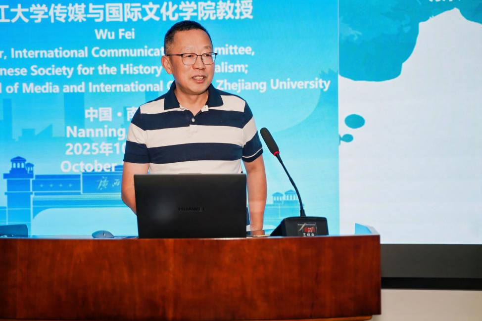 中国新闻史学会国际传播专业委员会理事长、浙江大学教授吴飞作题为《全球共通:国际传播新理论范式的哲学根基探索》的报告。他从文明冲突论的局限出发,提出国际传播理论反思;从哲学角度,探讨了人类交往的本质,并根据哈贝马斯、海德格尔等人的哲学理论,提出了国际传播理论新范式。他认为,承认存在,同时要接受对方,理解对方,尊重对方,这个世界才有可能真正做到费孝通先生所强调的“各美其美”。