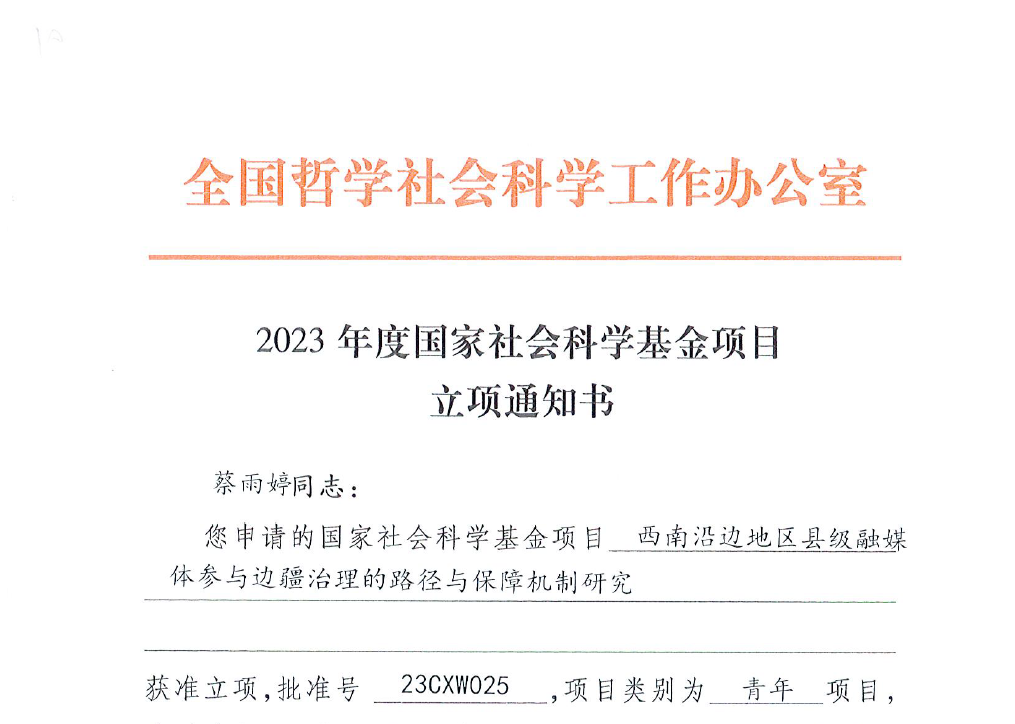 近日,全国哲学社会科学工作办公室公布了2023年国家社科基金年度项目和青年项目立项结果,公司蔡雨婷博士申报的青年项目“西南沿边地区县级融媒体参与边疆治理的路径与保障机制研究”获得立项。