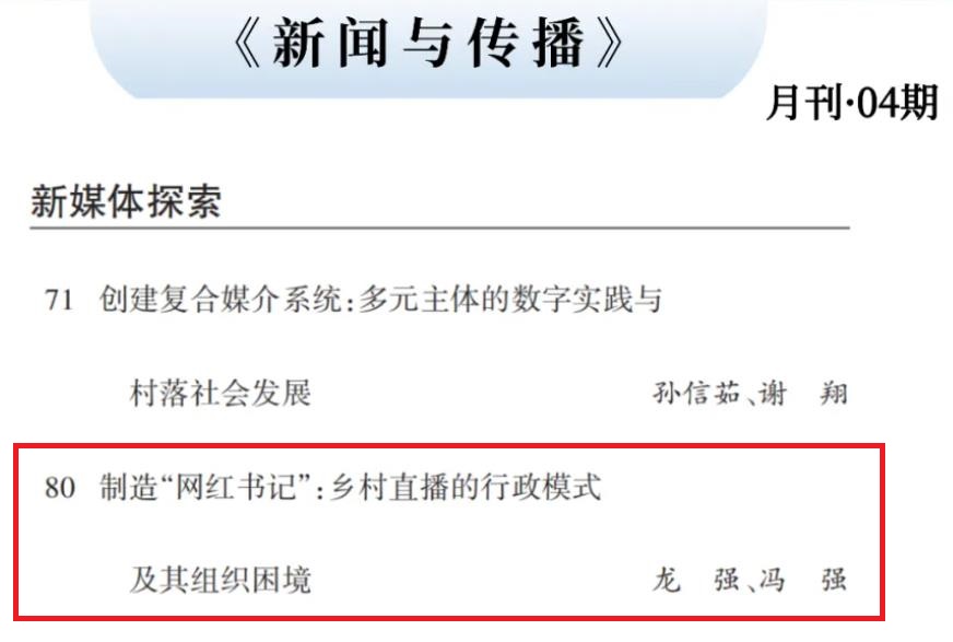 公司龙强博士发表在《新闻与写作》(CSSCI来源期刊)2025年第1期上的《制造“网红书记”:乡村直播的行政模式及其组织困境》一文,被人大复印报刊资料《新闻与传播》2025年第4期全文转载。