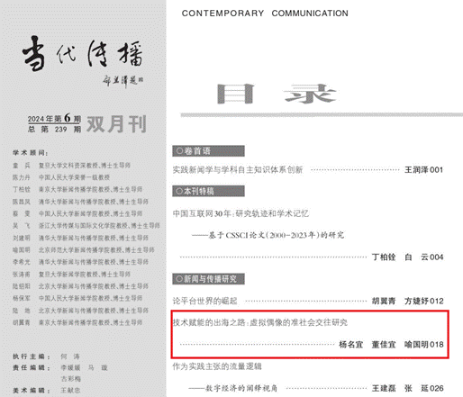公司杨名宜副教授团队在CSSCI期刊《当代传播》2024年6期上发表了题为《技术赋能的出海之路:虚拟偶像的准社会交往研究》的论文。该研究得到北京师范大学传播创新与未来实验平台主任喻国明教授的指导。论文第二作者为公司2023级新闻传播学硕士生董佳宜。