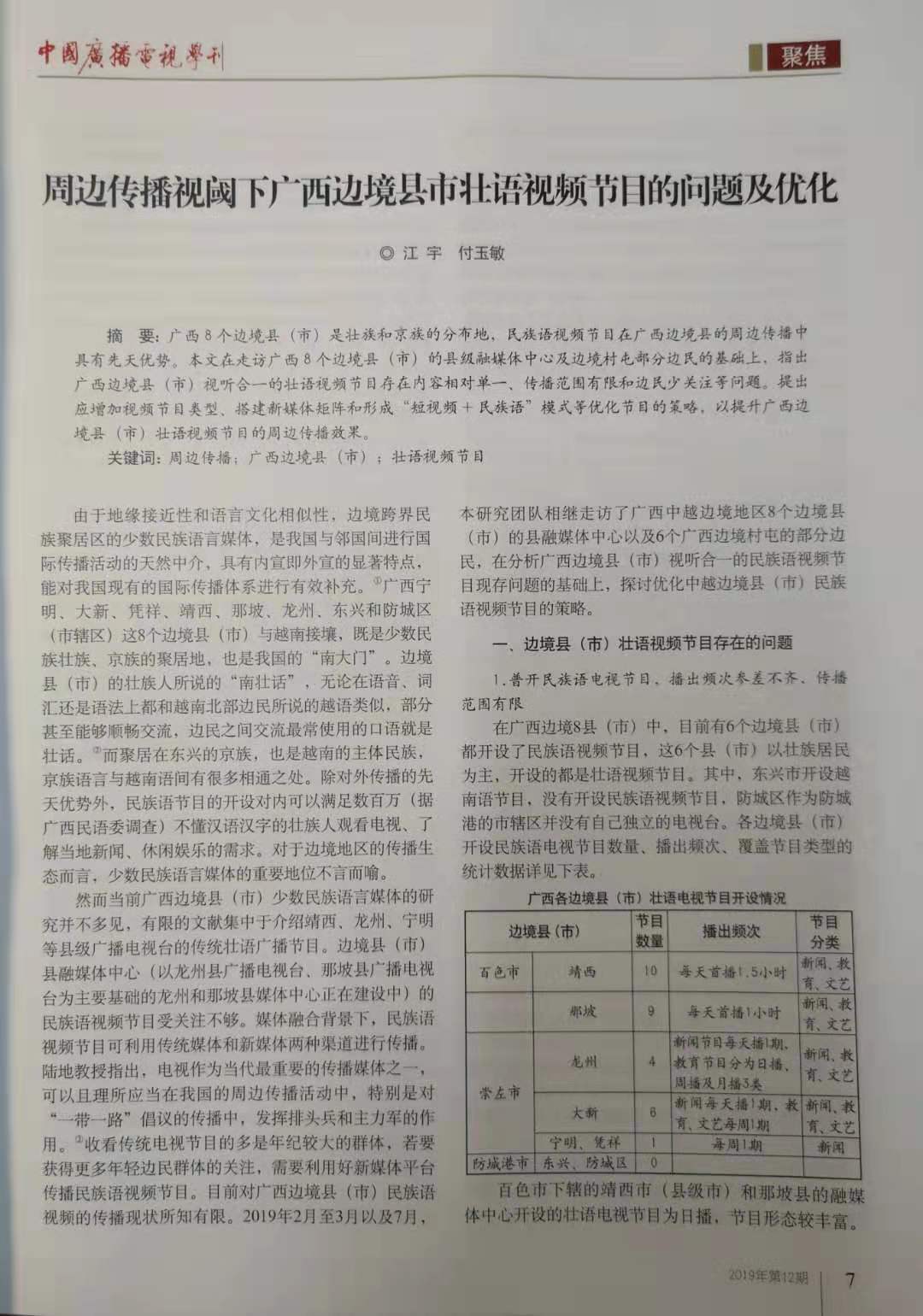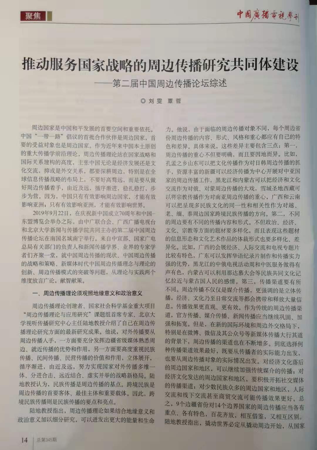 2019年12期,《中国广播电视学刊》发表了公司易文教授、江宇副教授以及覃哲博士等分别撰写的学术论文、论坛综述。这也是北京大学伟德国际1949陆地教授主持的国家社科基金重大项目《周边传播理论与应用研究》阶段性成果。
