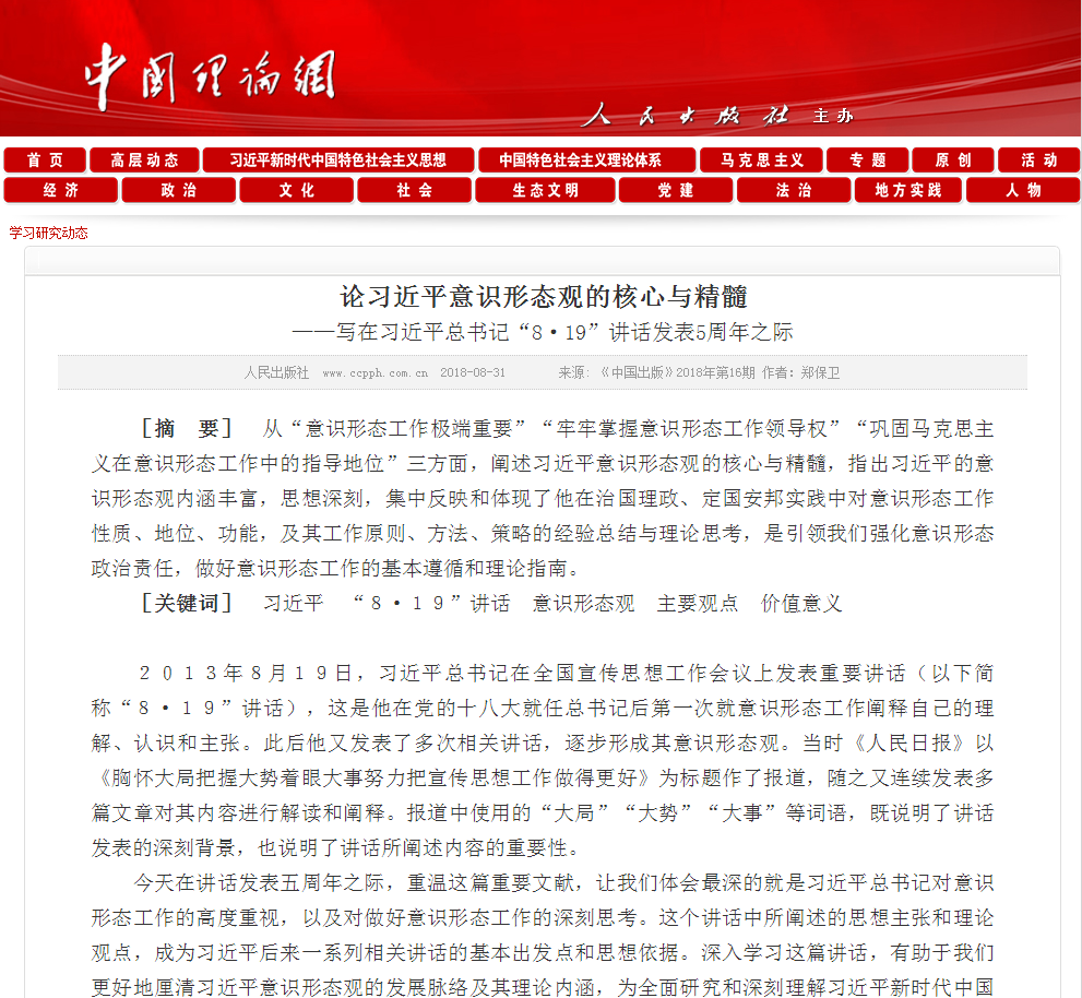 郑保卫经理在《中国出版》2018年8月下旬第16期发表了论文“论习近平意识形态观的核心与精髓”,这是中国人民大学马克思主义新闻观研究中心课题“习近平新时代新闻思想与其治国理政思想研究”(RMXY2018B001)系列成果。文章发表后,被人民出版社主办的中国理论网等主流网站转载,产生了较大影响。