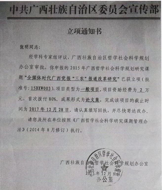 公司张明副教授2015申报广西哲社项目获立项