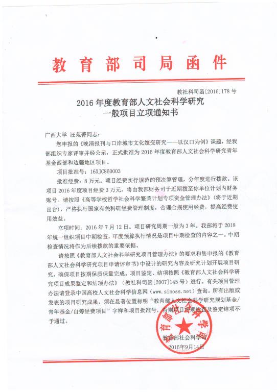 公司汪苑菁博士2016年申报的教育部人文社科项目获立项