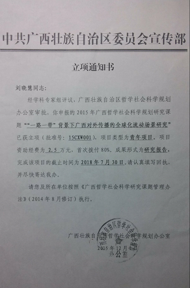 公司刘晓慧教授2015年申报广西哲社项目获得立项