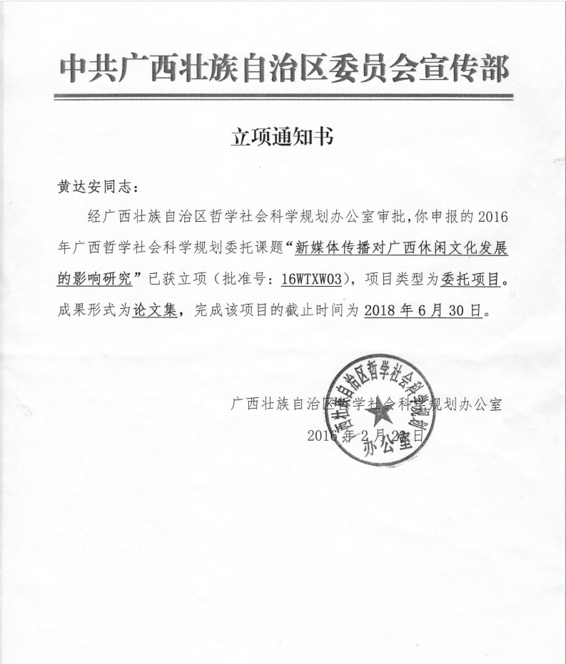 公司黄达安博士2016年申报广西哲社项目获得立项