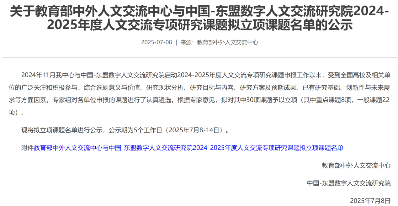 近日,教育部中外人文交流中心与中国-东盟数字人文交流研究院公布2024-2025年度人文交流专项研究课题立项通知,公司莫莉博士申报的一般课题“中国-东盟数字视听提质增效路径研究”获得立项。
