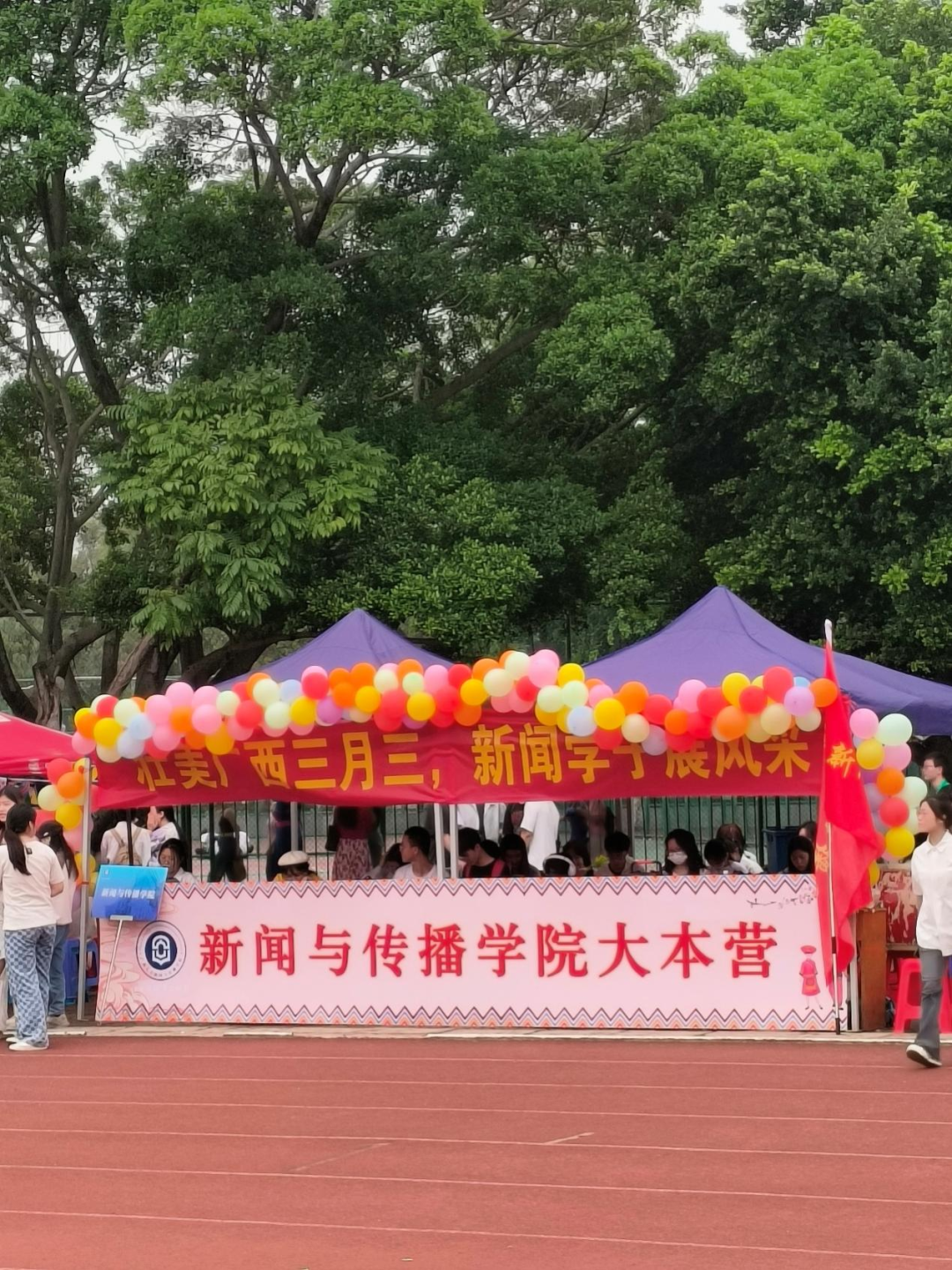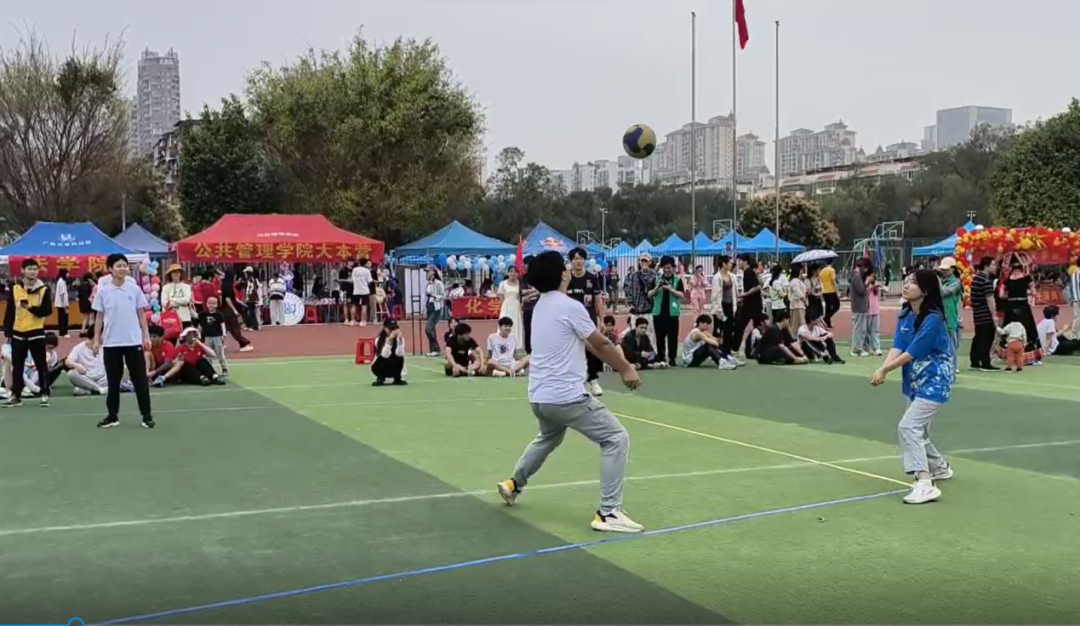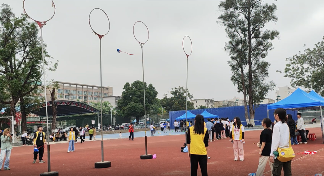 彩色的丝带在空中飞舞,绣球旋转飞入框中,高杆投绣球吸引不少同学参与,大家共同感受广西特色体育民俗风情。