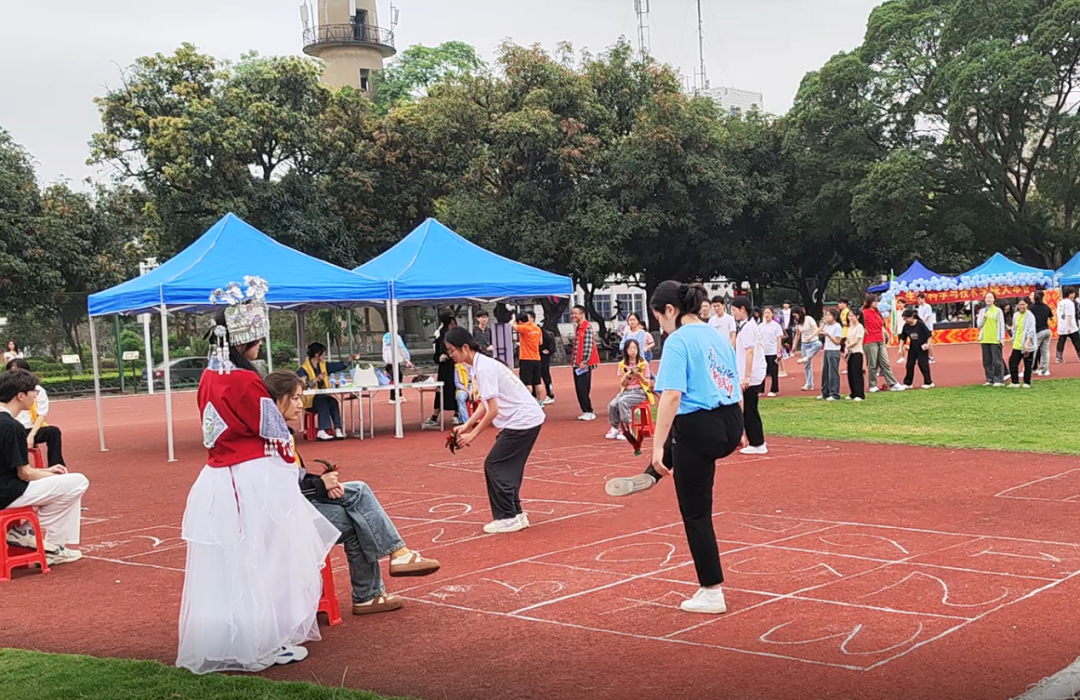 除此之外,民族文化体验活动还开展有抢绣球、射箭、踢毽子、板鞋竞速等竞赛类,同学们纷纷来到感兴趣的项目前排起队,现场热闹非凡。