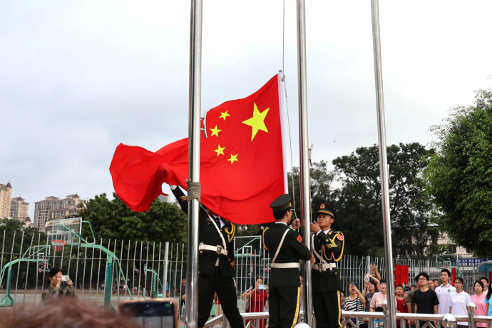伴随着激昂的旋律,五星红旗师生们的注目中缓缓升起,