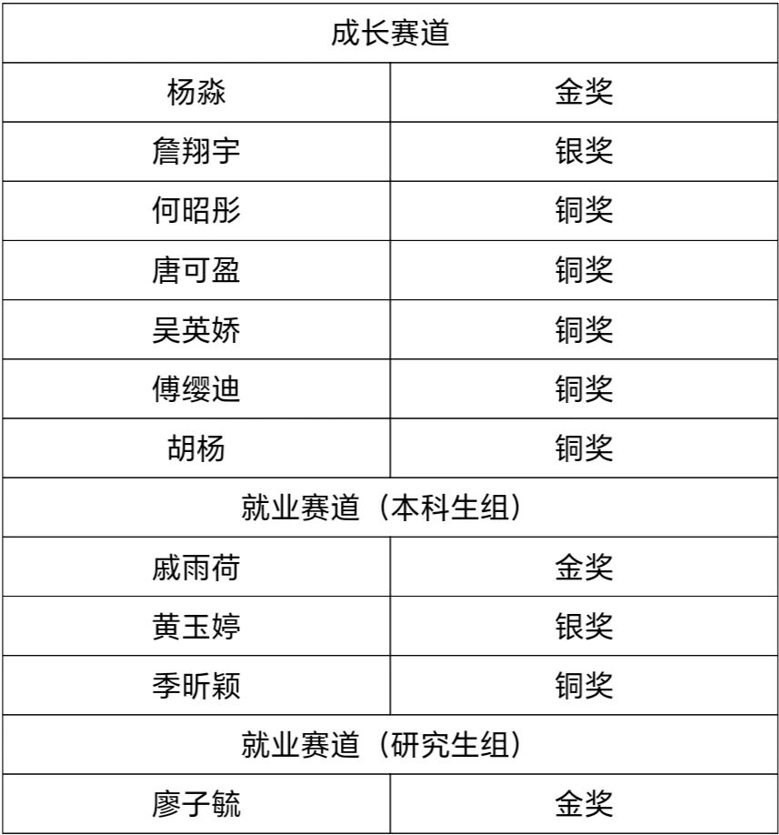 经院级初赛、校级初赛层层遴选,全校60名选手入围决赛,公司5名选手晋级,戚雨荷、杨淼、廖子毓分获本科生就业赛道、成长赛道、研究生就业赛道金奖,詹翔宇等8名学子摘得银、铜奖。