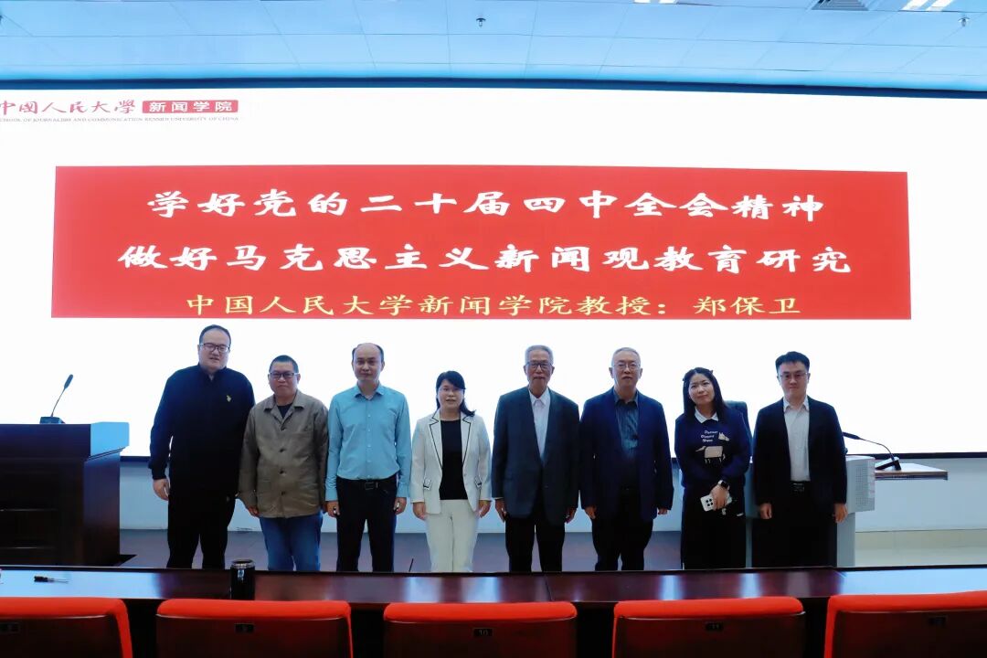 讲座中,郑保卫教授首先围绕党的二十届四中全会精神展开解读。他指出,不久前闭幕的党的二十届四中全会,为我们国家未来一个时期的发展,描绘了宏伟蓝图,指明了前进方向。全会公报深刻揭示了做好意识形态工作的极端重要性和现实紧迫性。他强调,意识形态工作关乎国家立心、民族立魂,而新闻舆论工作是意识形态斗争主阵地,马克思主义新闻观作为党的新闻舆论工作的 “定盘星” 和 “灵魂”,与意识形态工作相互依存、促进,共同守护国家意识形态安全。探讨主流意识形态建设,筑牢意识形态阵地,就必须深入思考如何更好地开展马克思主义新闻观教育。