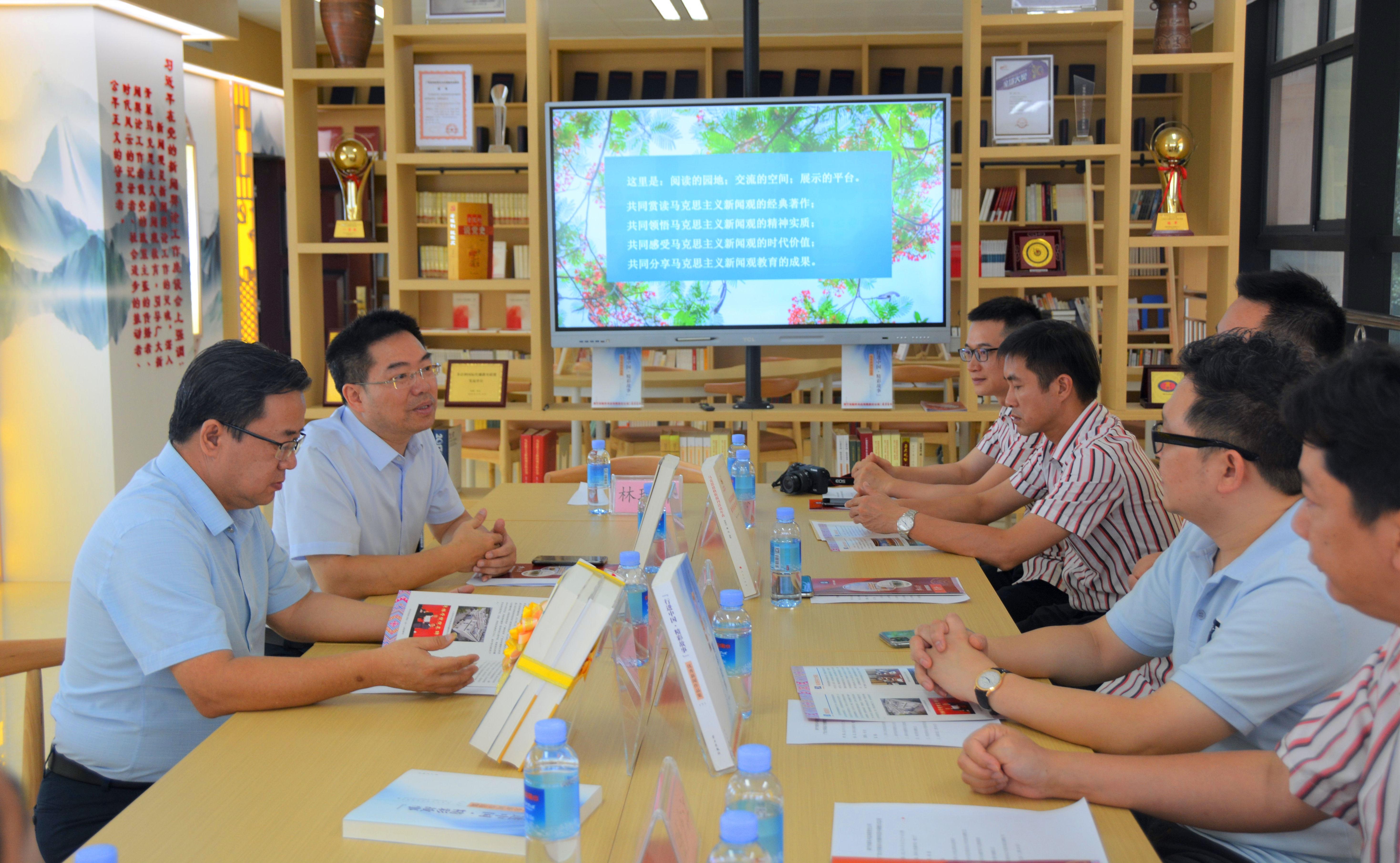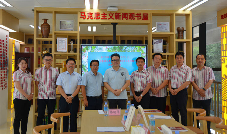 随后,公司师生代表与南宁市新华书店负责人在马克思主义新闻观书屋进行了座谈交流。公司领导向与会人员介绍了公司建设马克思主义新闻观书屋的初衷及开展马克思主义新闻观公司产品的具体情况。他希望通过马克思主义新闻观书屋,从阅读经典、培养新闻情怀和做好新闻实践三方面加强员工的新闻素养,牢固树立起马克思主义新闻观,为党、政府和人民培养更多的“耳目喉舌”。双方还就加强进一步合作进行了深入地研讨交流。